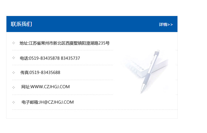 地址:常州市新北區友邦商務大廈1幢16、17層  電話:0519-85101652  傳真:0519-85112595  郵編:213022  網址:www.cz-jiayue_cn.cdyizheng.com  郵箱:xiajifengaa@163.com